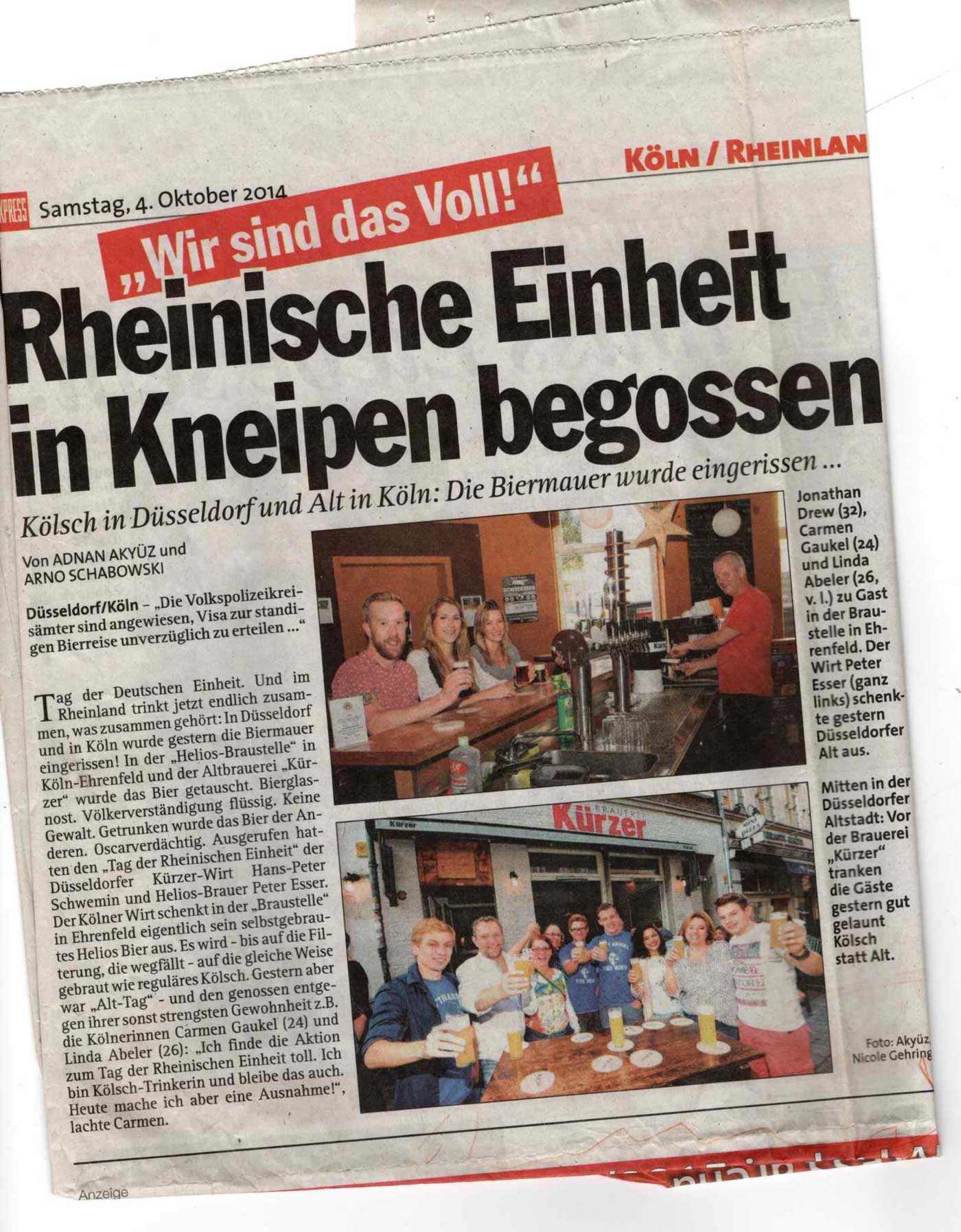 Aufgrund der Herkunft des Braumeisters und als Beitrag zur Verständigung mit der Nachbarstadt Düsseldorf servieren wir seit 2004 das selbstgebraute Ehrenfelder Altbier.